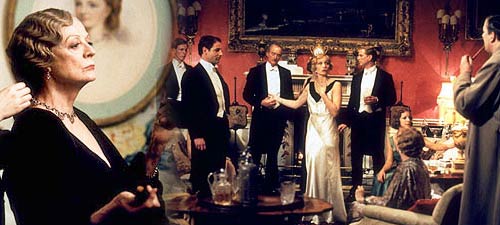 The exhilaration is slow to build. It doesn't come from any one thing but from countless crosscurrents, tiny bits of color that fill out the portrait: a fleeting subversive smirk of first footman Richard E. Grant; the Hollywood dreams of second footman Jeremy Swift; the moist, lap-dog attentiveness of Gambon's valet, Derek Jacobi; the stiff, saturnine (inebriated?) imperiousness of Bates' white-browed butler. Slinky, enigmatic visiting valet Clive Owen gives off sinister vibes, like a romantic Boris Karloff. While the matinee idol Ivor Novello (Jeremy Northam) plays and sings for the guests (and the discreetly star-struck servants), Smith's countess bemoans his vulgarity: Does she resent him for being a showman or because he's gay (something only hinted at here)? She's an awful snob, yet the great actress suggests something frightened and vulnerable beneath her ostentatious sense of entitlement.